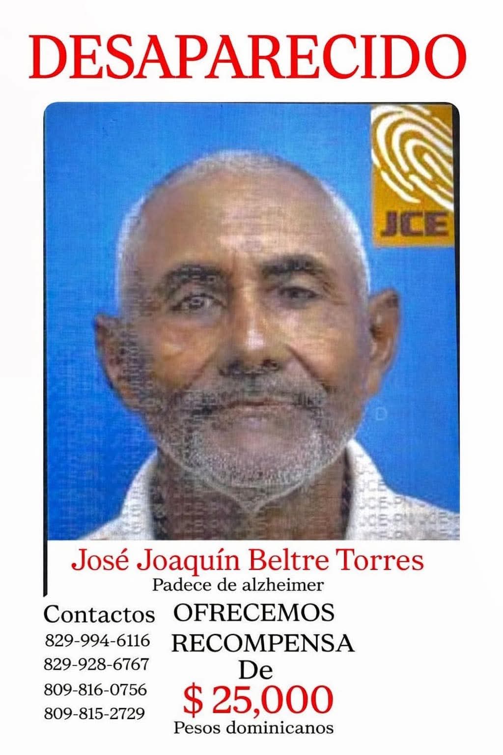 Azua, República Dominicana. — Fue reportada la desaparición del señor José Joaquín Beltre Torres, un adulto mayor residente en esta provincia, cuyo paradero se desconoce hasta el momento, según informaron sus familiares.